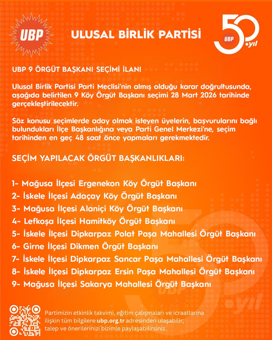 Ulusal Birlik Partisi Parti Meclisi’nin almış olduğu karar doğrultusunda, aşağıda belirtilen köy ve mahallelerde Örgüt Başkanı seçimleri 28 Mart 2026 tarihinde gerçekleştirilecektir.